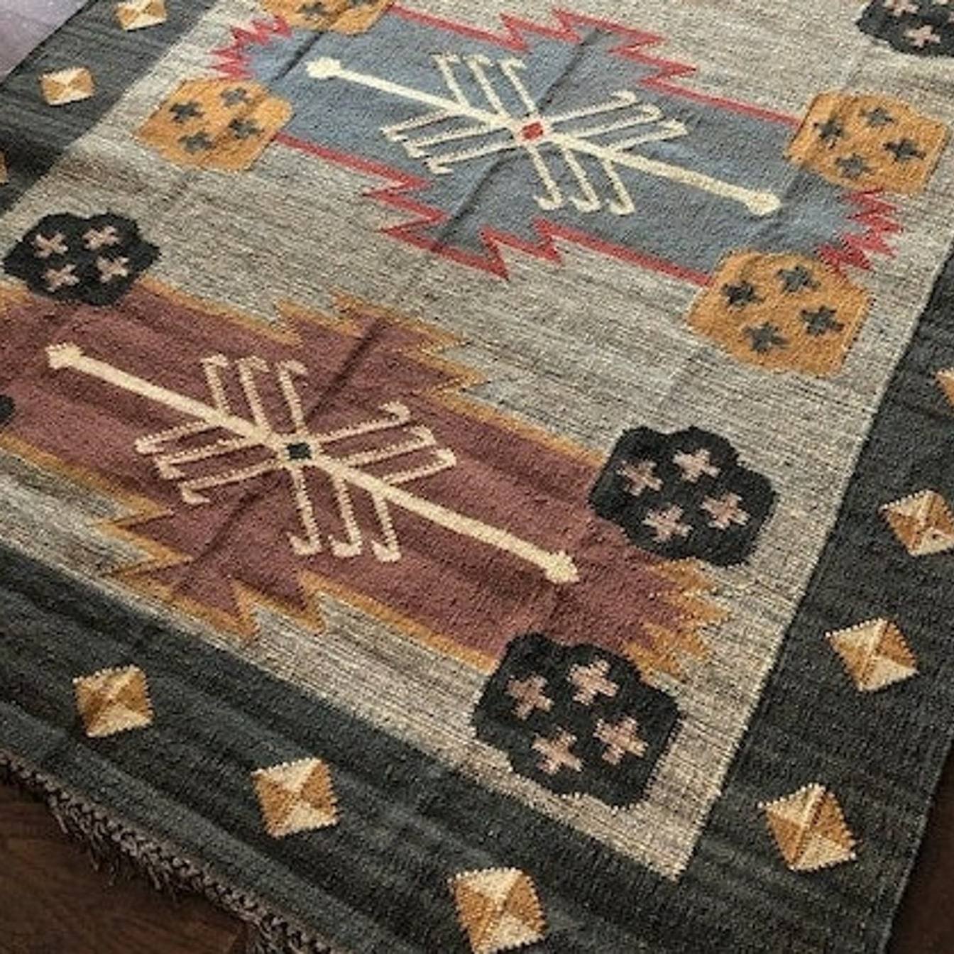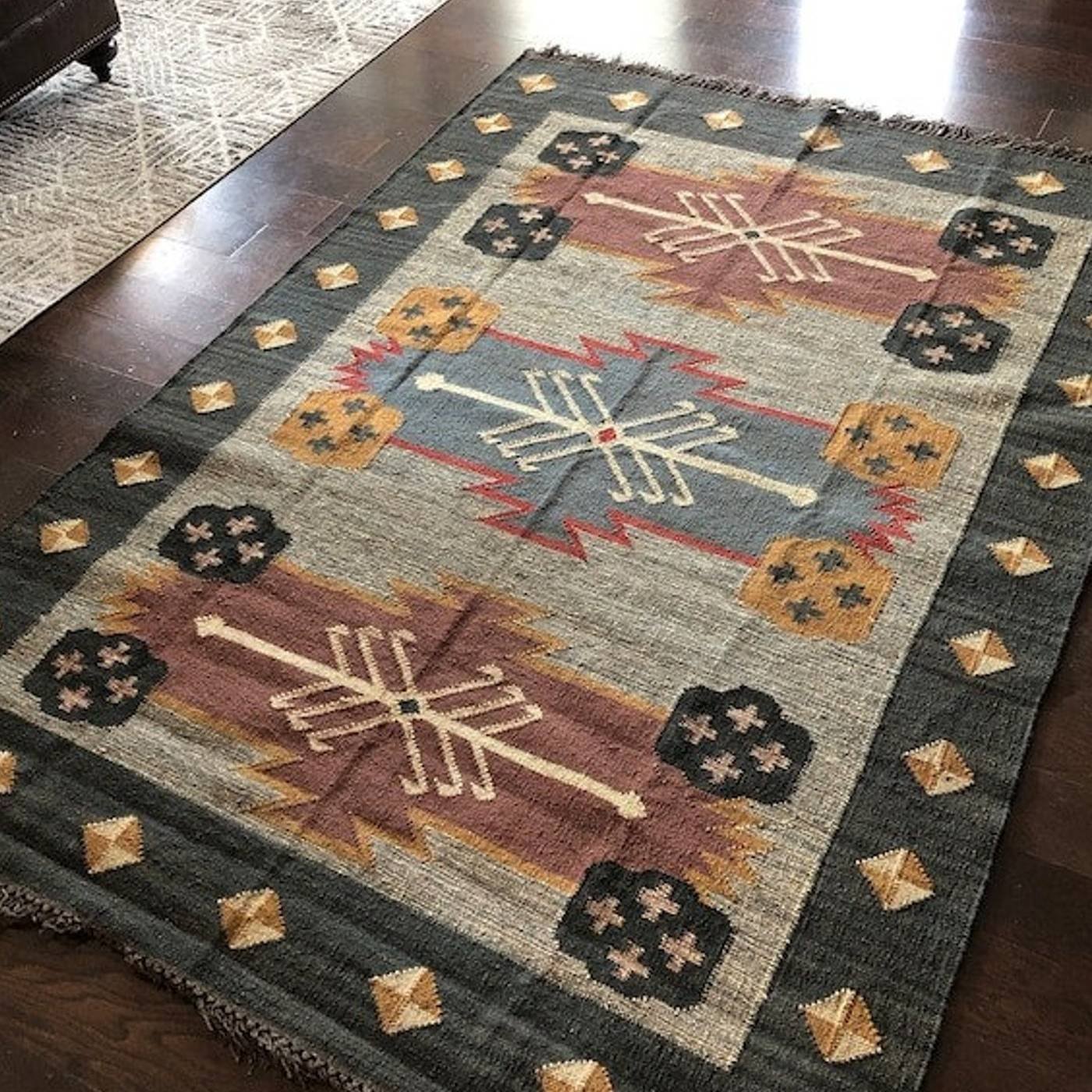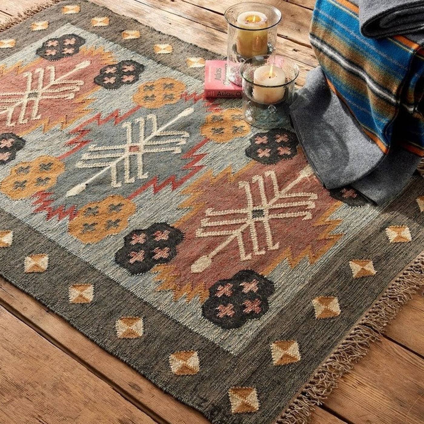 Förvandla ditt utrymme med den livfulla charmen hos denna handvävda Boho ull jute kilim matta