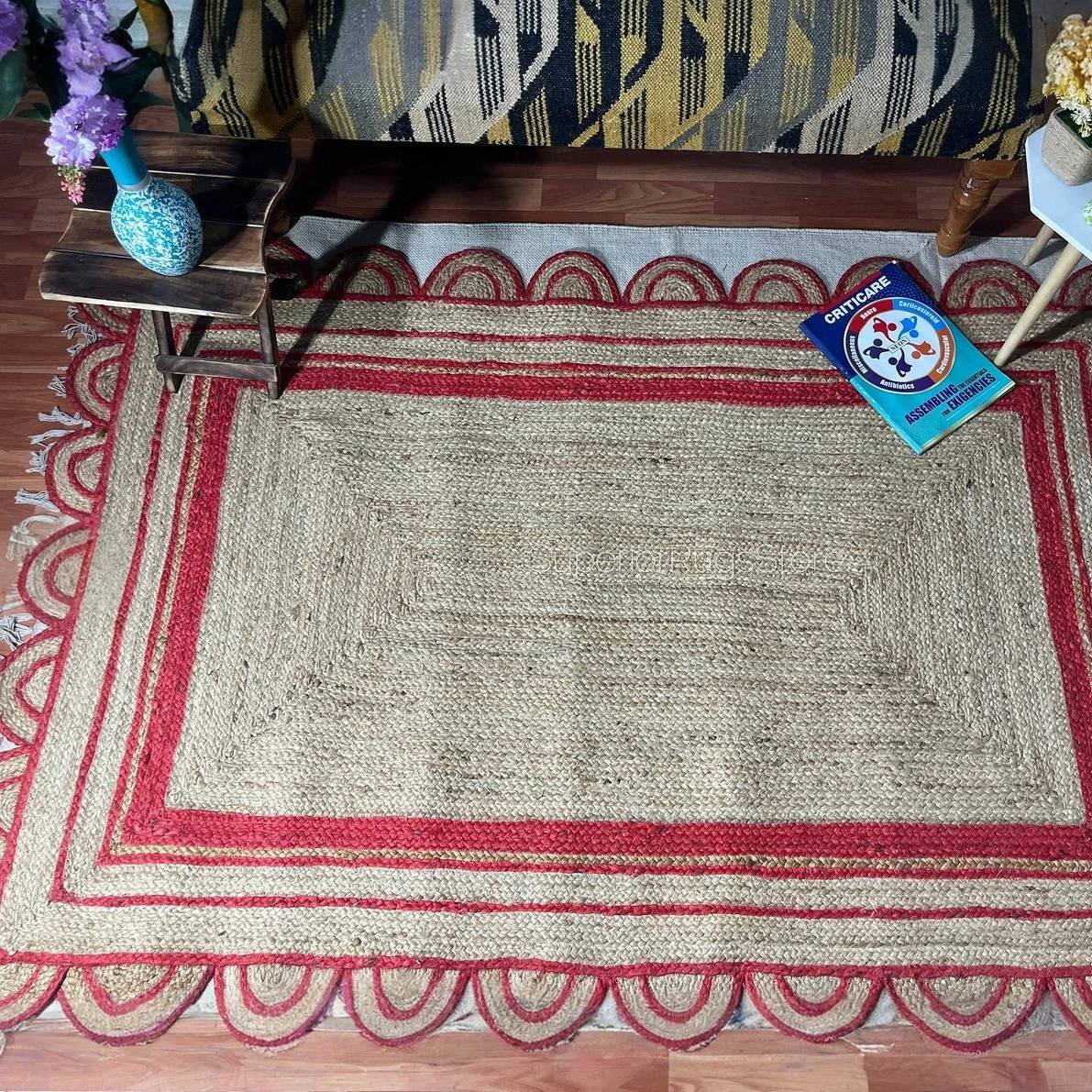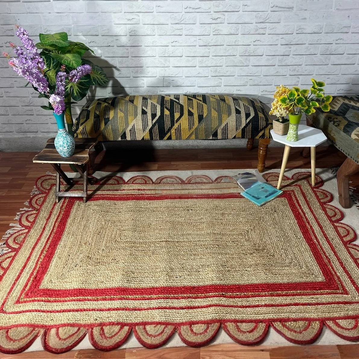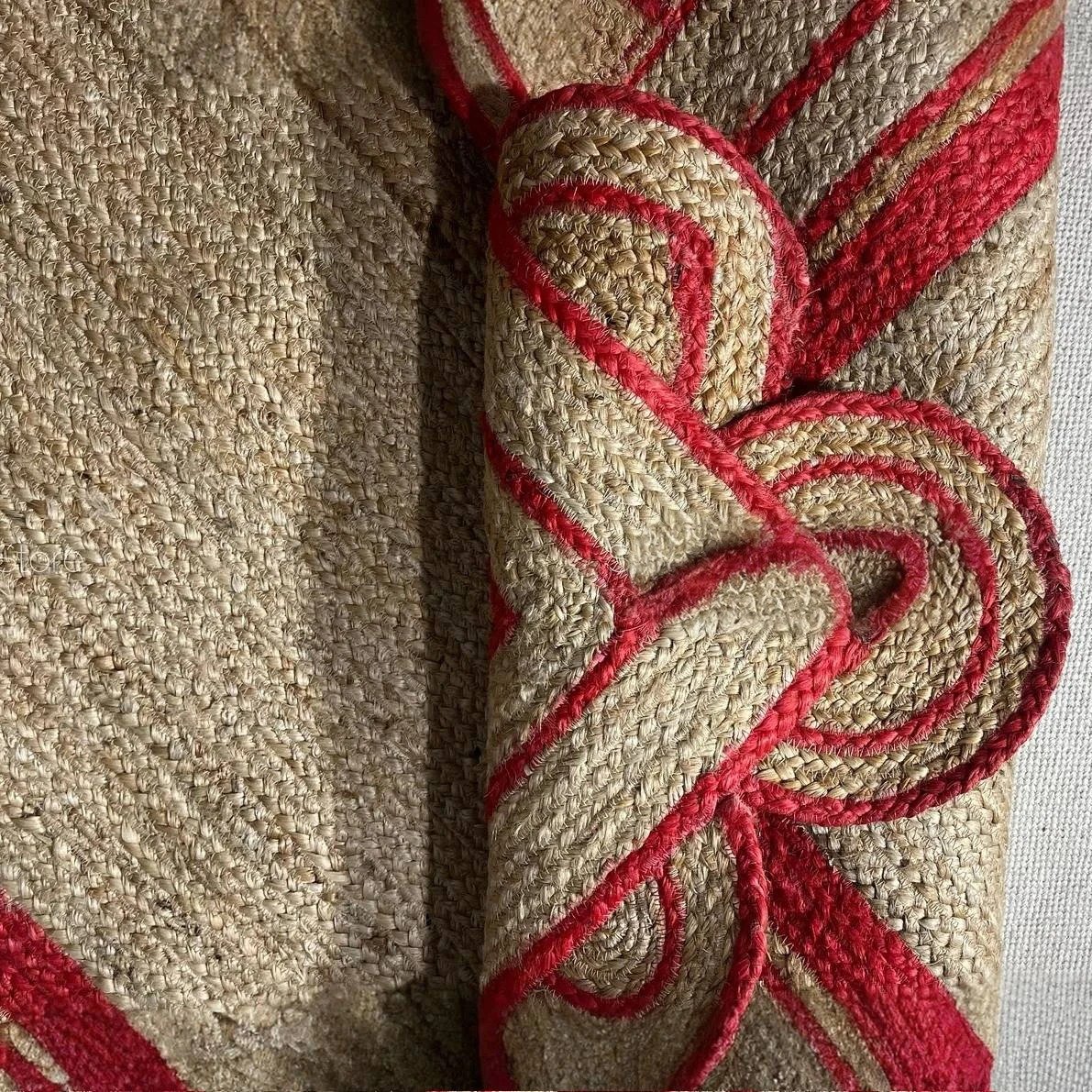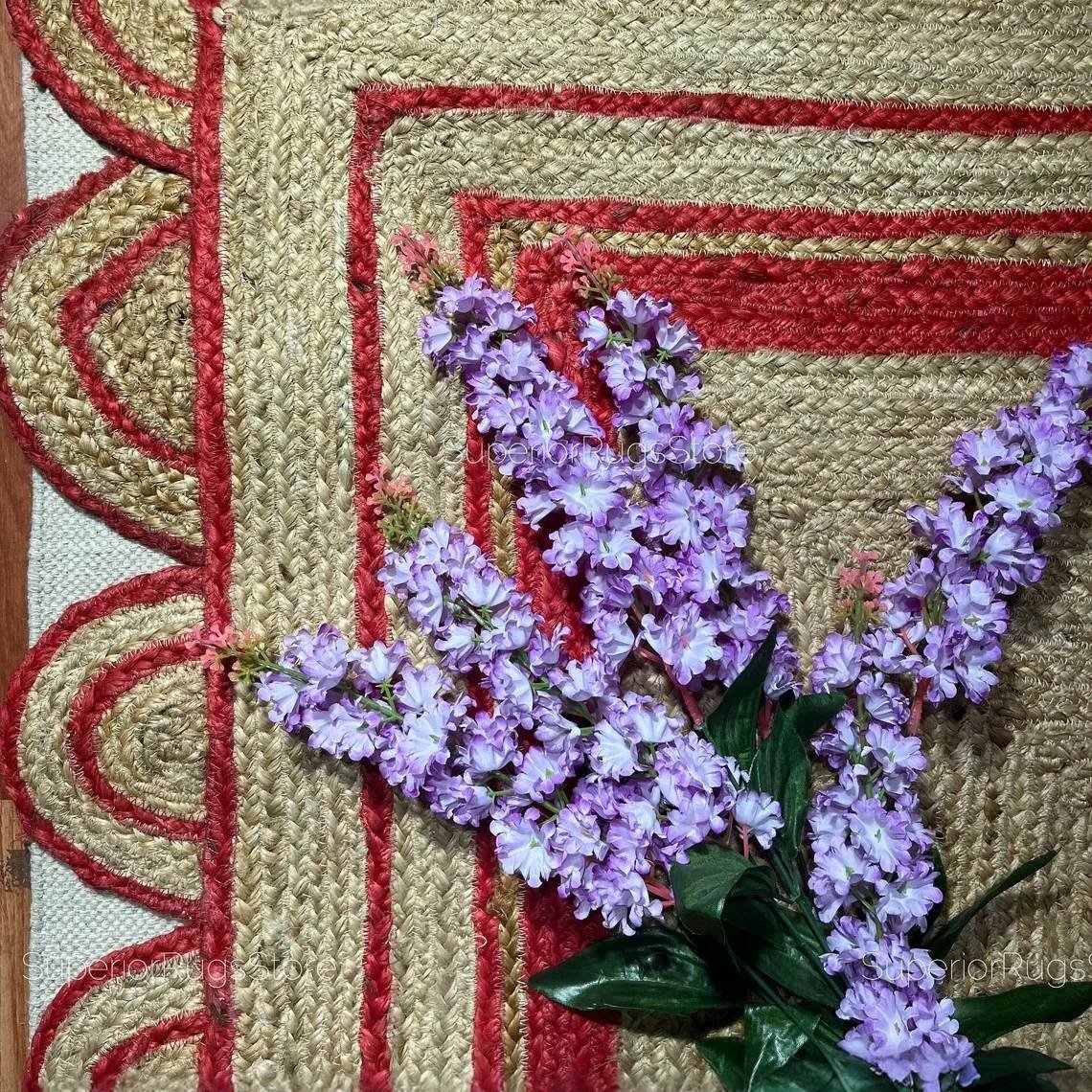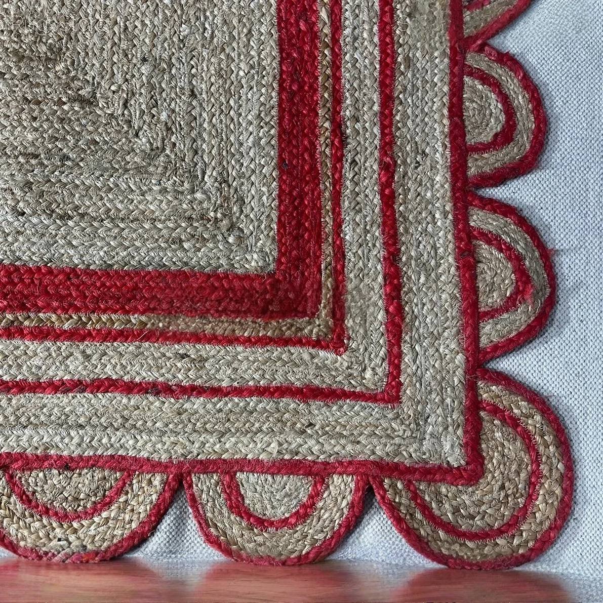 Förhöj ditt utrymme med den lekfulla charmen hos denna röda jute-matta med skulpterad kant